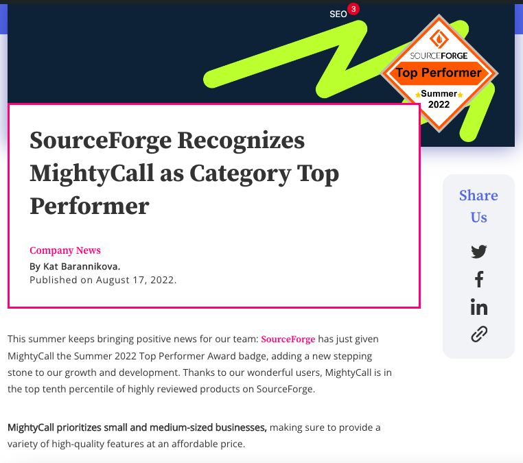 MightyCall is a fast and secure virtual phone system that provides online phone numbers for business. I worked at MightyCall as a full-time copywriter for 2.5 exciting years. I was in charge of writing, proofreading, editing, and creating SEO content, such as blog posts, UX descriptions, landing pages, and more.